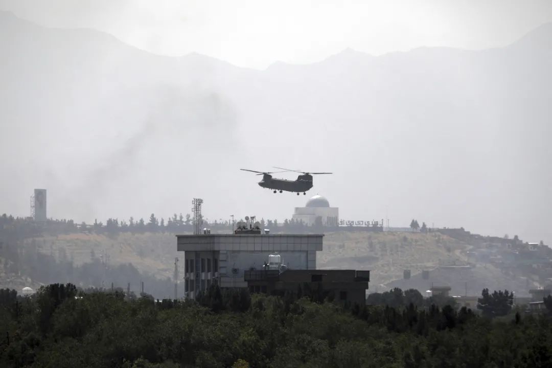 当地时间8月15日,阿富汗喀布尔,一架美国“奇努克”直升机在美国驻阿大使馆附近飞过。