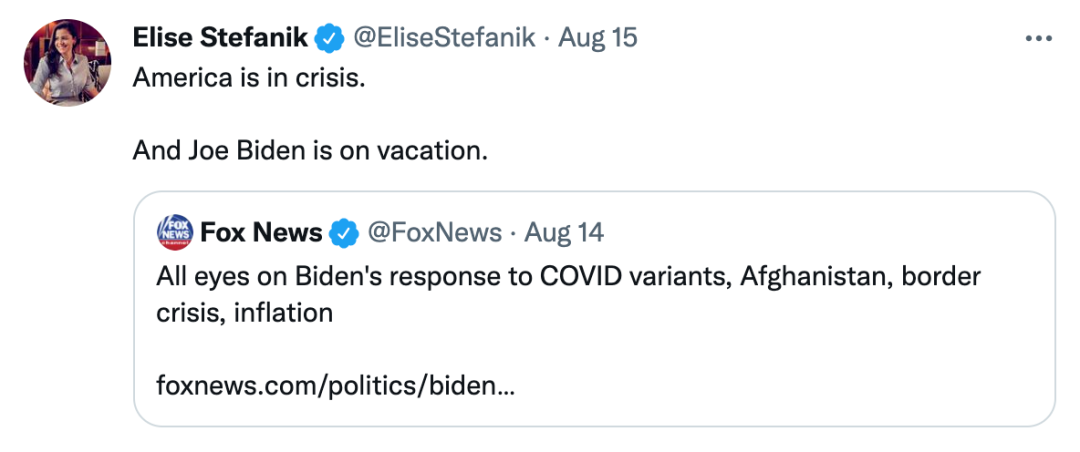 据福克斯新闻网报道,多名美国共和党议员在社交媒体上抨击拜登“失职”。众议院共和党三号人物伊莉斯·斯特凡尼克(Elise Stefanik)发推特称,“美国正处于危机之中,而拜登正在度假。”
