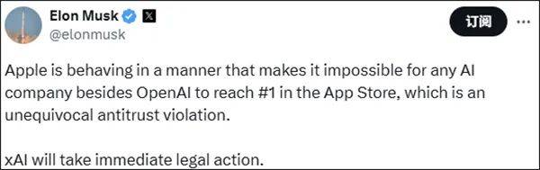 随后,他再次发文表示,苹果公司的行为方式使得OpenAI以外的任何AI公司都无法在苹果商店排行榜中排名第一,这明显违反反垄断法,xAI将立即采取法律行动。
