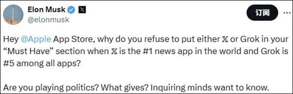 马斯克提出,X平台是全球排名第一的新闻应用,而Grok在所有应用中排名第五,为什么苹果公司拒绝将X平台或Grok列入苹果商店“必备”类别?“你在玩政治吗?怎么回事?好奇的人想知道。”