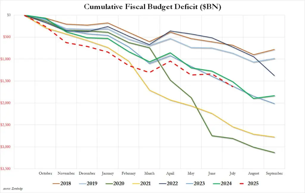 随着本财年于9月接近尾声,美国正走向又一个巨额年度赤字。据报道,截至2025财年7月,过去十个月的预算赤字累计达1.63万亿美元,经日历调整并剔除2024年收到的递延税款影响后,较上年同期收窄4%。