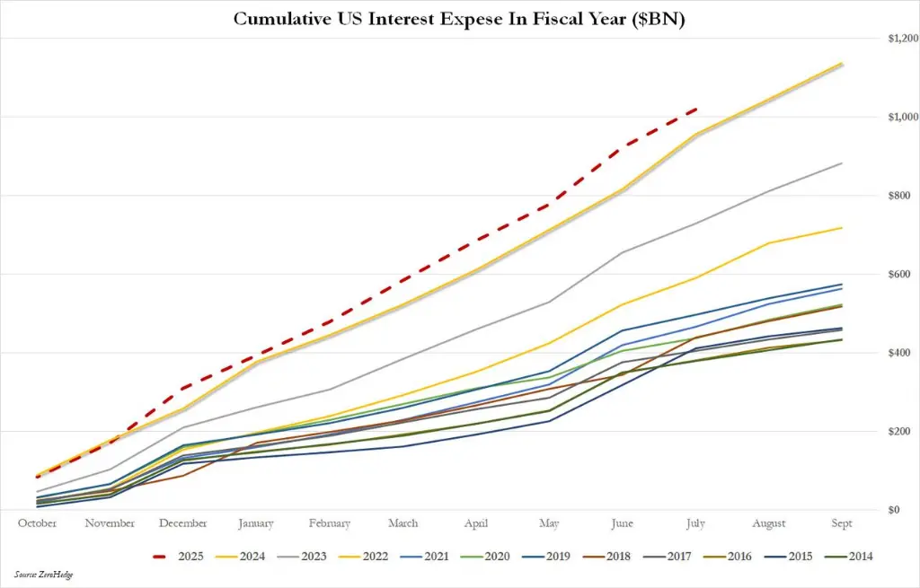 七月份,美国政府仅利息支出就高达919亿美元。这使得本财年前十个月的累计利息支出达到创纪录的1.019万亿美元,并有望在整个财年超过1.2万亿美元。