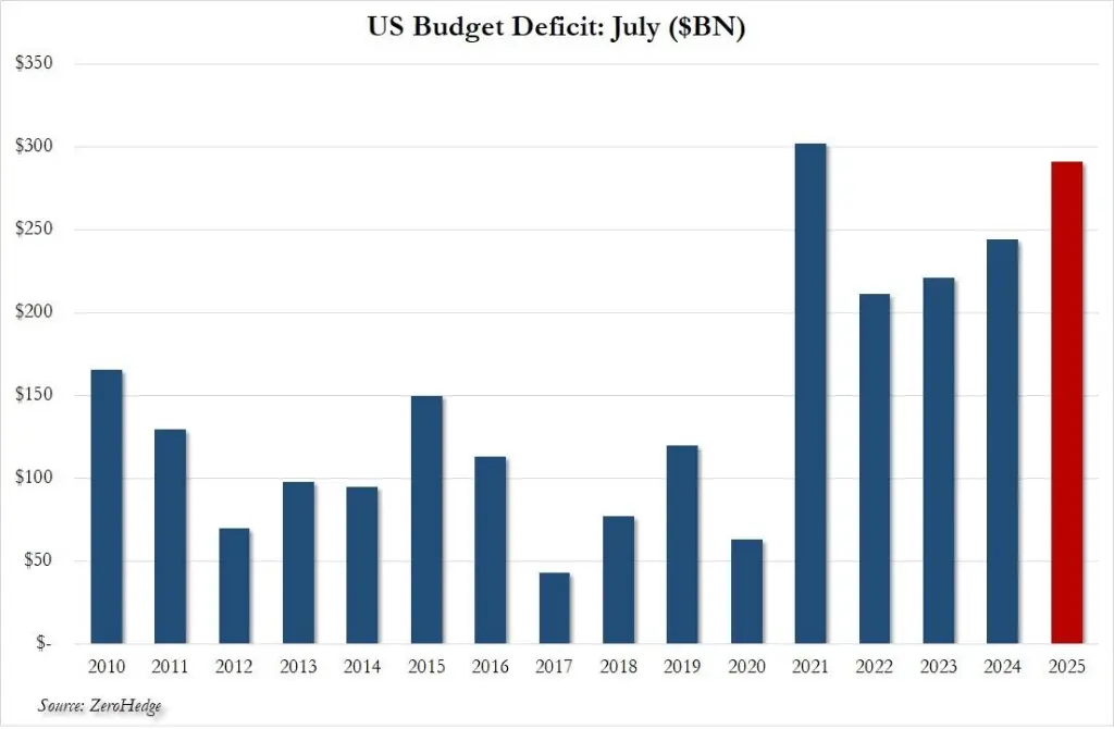 这也创下了美国历史上7月单月赤字的第二高纪录,仅次于疫情暴发后、财政支出陡增的2021年。