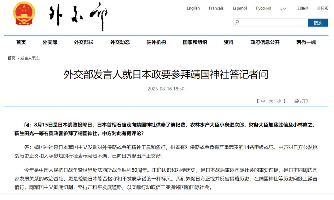 8月16日,外交部发言人就日本政要参拜靖国神社答记者问。