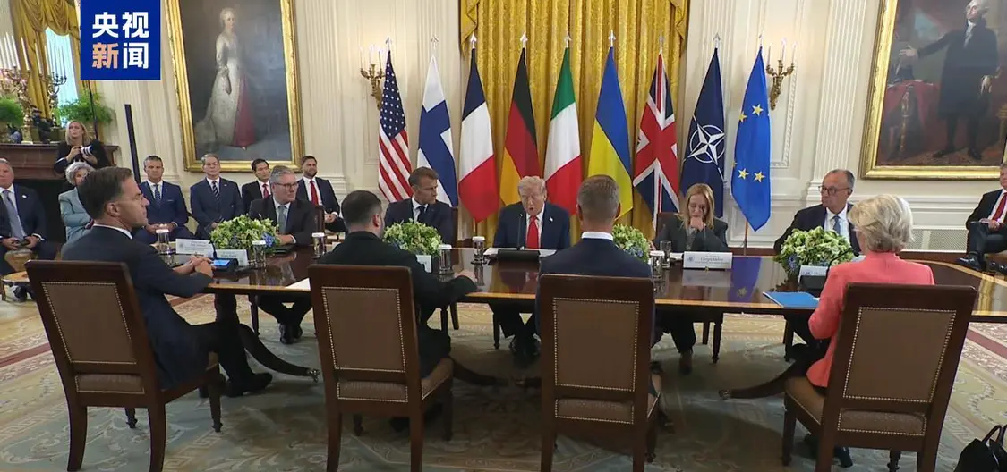 当地时间8月18日,美国总统特朗普在白宫与到访的欧洲领导人举行多边会晤。除特朗普与乌克兰总统泽连斯基外,与会者包括欧盟委员会主席冯德莱恩、法国总统马克龙、德国总理默茨、英国首相斯塔默、意大利总理梅洛尼、芬兰总统斯图布以及北约秘书长吕特。