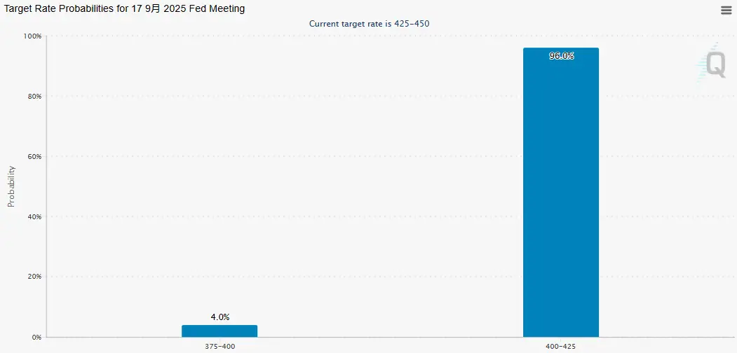 根据芝商所(CME)的“美联储观察”工具最新数据显示,市场预计今晚降息25个基点的概率高达96.0%,而降息50个基点的概率仅为4%。