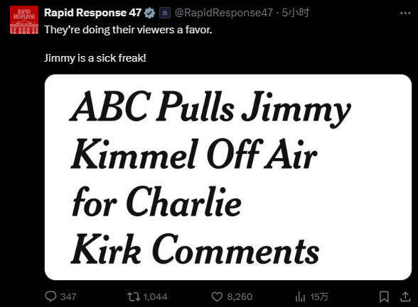 “恭喜ABC终于有勇气做必须做的事,”特朗普在社交媒体发文,还点名了另外两个脱口秀节目《吉米·法伦秀》(别名“肥伦秀”)和《塞斯·梅耶斯晚间脱口秀》。