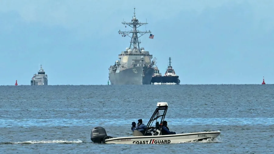 10月26日,美军导弹驱逐舰“格雷夫利”号(上中)在特立尼达和多巴哥首都西班牙港附近海域航行。 新华社发