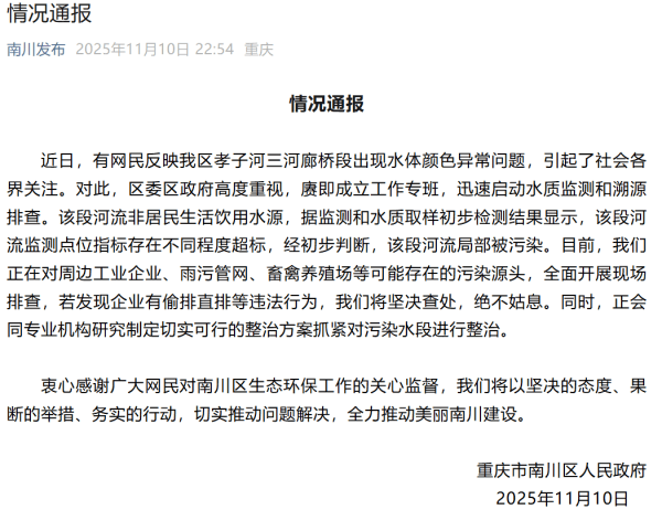 针对有网友反映孝子河水有发黑的情况,重庆市南川区南平镇政府11月9日发布通报称,该区专题研究排查整治工作,已派出专业人员开展源头排查和水质监测等工作,全力维护保障水环境安全。相关原因还在调查中。