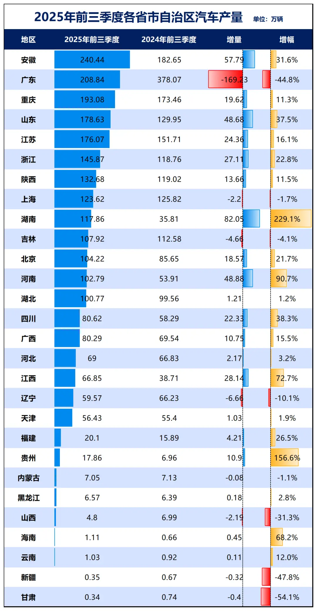 今年前三季度,安徽继续蝉联第一,产量已经跃升到240.44万辆。广东第二,产量为208.84万辆。