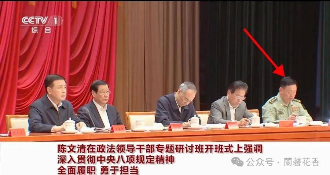 2025年5月8日,中央政法领导干部专题研讨班开班。央视报道现场画面显示,在主席台就座的11人中,包括中共政法委书记陈文清(中央政治局委员、中央书记处书记)、副书记王小洪(中央书记处书记、国务委员、公安部部长)、委员张军(最高法院院长)、应勇(最高检察院检察长)、陈一新(国家安全部部长)、贺荣(司法部部长)、訚柏(秘书长)等七名中央政法委成员。而另外两名中央政法委委员、海军上将、军委政法委书记王仁华与武警部队司令王春宁双双缺席专题研讨班开班式。出现开班式的戎装代表是武警部队副司令员曹均章中将。(见下图)