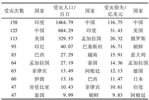 表2给出了1950-2004年全球重大洪水灾害地区分布。由表2可见, 不论受灾人口还是受灾损失,中国都是世界上最严重的国家。严重的洪水灾害, 造成了巨大的经济损失,这将对中国经济的可持续发展产生重大影响。