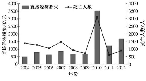 图1 2004 - 2012年中国暴雨灾害造成的直接损失与死亡人数