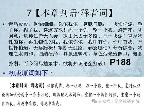 曰:青鸟殷殷,软语细细;你侬我侬,算赋口赋;一块知识泥,塑了你,捏了我。将这方泥!捏一个你,塑一个我。蝶恋花,凭阑意;危楼伫倚无人会,蓬山此去无多路。把一块泥!重捏物性的你,再生物性的我。我侬你侬,我中有你,你中有我。把栏杆拍遍,天际黯极!望断天涯路,春愁哪怕?分析综合,物理之水调和;归纳演绎,具象逻辑树。草色烟光残照里,概念扑朔。而今阅尽抽象术,欲将知识论全打破!