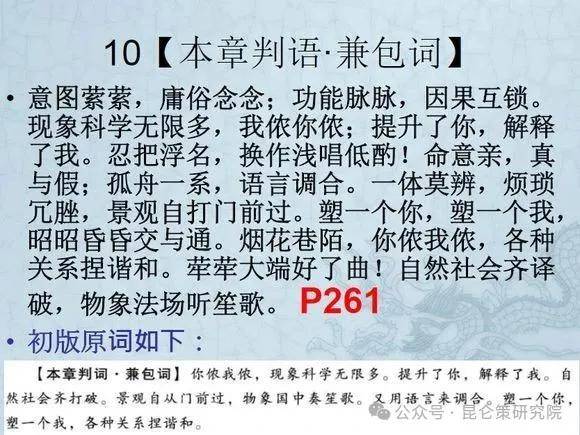 曰:意图萦萦,庸俗念念;功能脉脉,因果互锁。现象科学无限多,我侬你侬;提升了你,解释了我。忍把浮名,换作浅唱低酌!命意亲,真与假;孤舟一系,语言调合。一体莫辨,烦琐冗脞,景观自打门前过。塑一个你,塑一个我,昭昭昏昏交与通。烟花巷陌,你侬我侬,各种关系捏谐和。荦荦大端好了曲!自然社会齐译破,物象法场听笙歌。