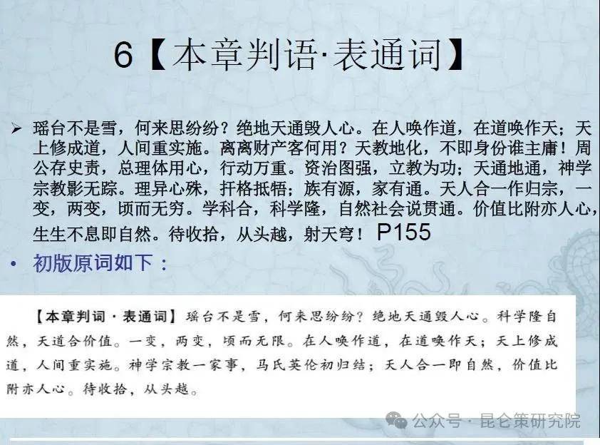 曰:瑶台不是雪,何来思纷纷?绝地天通毁人心。在人唤作道,在道唤作天;天上修成道,人间重实施。离离财产客何用?天教地化,不即身份谁主庸!周公存史责,总理体用心,行动万重。资治图强,立教为功;天通地通,神学宗教影无踪。理异心殊,扞格抵牾;族有源,家有通。天人合一作归宗,一变,两变,顷而无穷。学科合,科学隆,自然社会说贯通。价值比附亦人心,生生不息即自然。待收拾,从头越,射天穹!