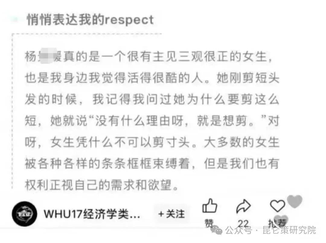 在“图书馆事件”反转后,杨某某的极端女权影子逐渐被扒。在这个过程中,网民发现其毕业论文不仅涉及性别议题,而且内容漏洞百出,包括但不仅限于涉嫌抄袭、数据造假、名词自拟、张冠李戴等典型的低级问题。群众对“名校如何通过如此问题论文并将之评优、还保送如此学术不端女学生赴香港读博”的情况,发起了集体质疑。