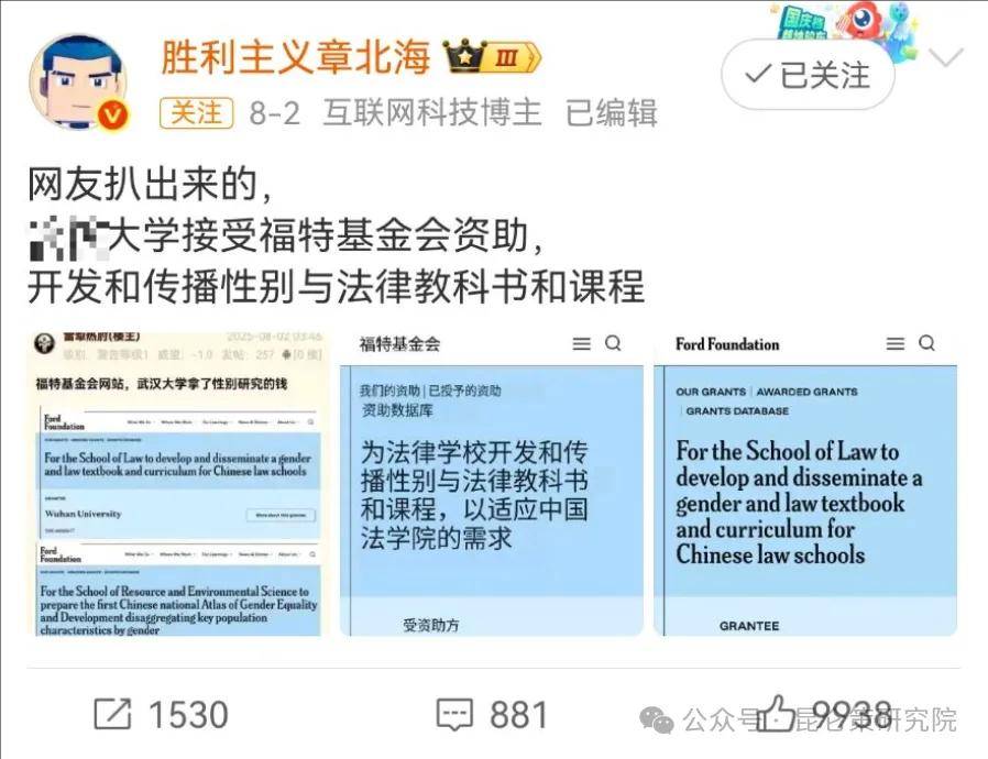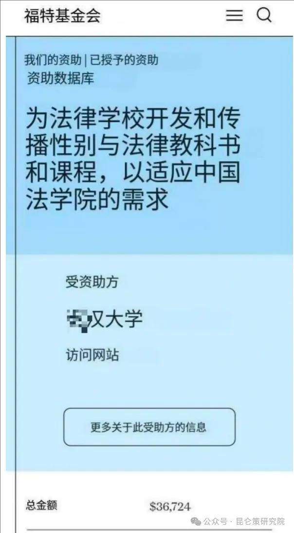 本次“图书馆事件”的主体高校,亦被网民顺藤摸瓜,扒出了其背后的境外资金链的问题。网民从美国驻某汉总领馆、某大学官方网站、福特基金会官方网站等渠道扒取信息,发现涉事高校多年来长期获得美国福特基金会等境外基金会、NGO的资金扶持,相关教师队伍亦通过境外基金会渠道赴境外交流,而交流的议题包含“性别议题”。