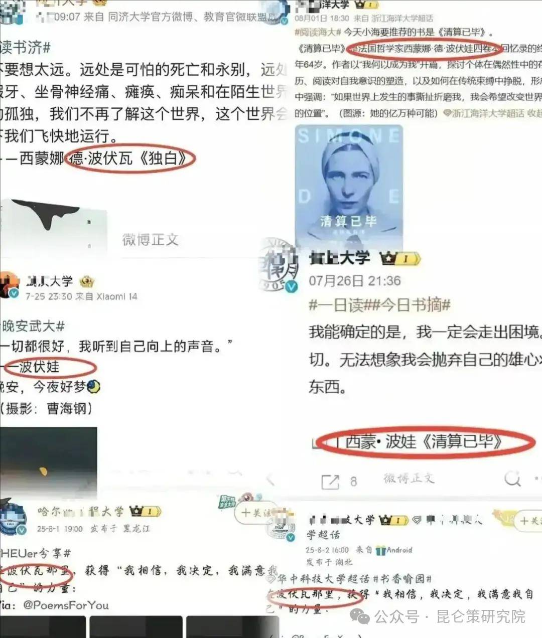 不仅仅如此,该校官方媒体还在社会质疑该校袒护极端女权问题的舆情发酵期,发布了极端女权主义群体颇为喜爱的西方女权活动家、女权主义鼻祖“波伏娃”的言论内容。更为炸裂的是,与此同时国内多所知名高校官方账号,也集中播发了波伏娃的内容,挑衅意味明显,亦引发舆论场的震惊与愤怒。