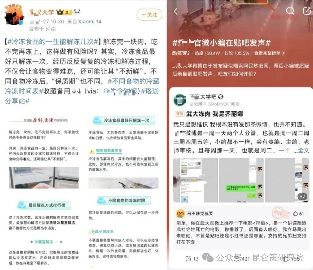 2025年7月25日,涉事地方法院宣布“图书馆事件”杨某谋举告不成立后,舆论开始转向质疑杨某某的母校(某知名大学,该校此前曾在没有确切证据情况下向舆论妥协,给予男学生记过处分,受害男生因此患精神疾病、有严重自杀倾向,家中多位长辈因网暴病故、病重)。面对舆论质疑,涉事高校的官方社交媒体账号不仅不回应群众质疑,还发布了极具争议的“冻肉博文”。
