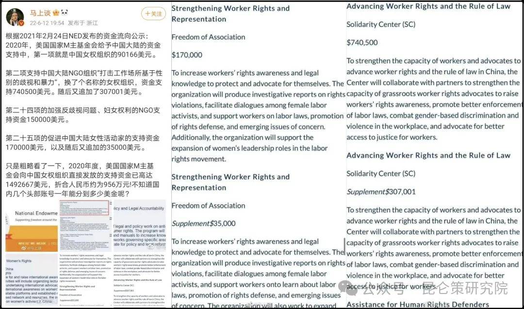 事实上,西方资助境内的高校与极端女权,早已不是新鲜事。早在2019年,就有媒体调查发现,美国NED给“中国女权运动”群体提供了19.3万美元+6万美元的资助。2022年,亦有博主曝光,从2020年起,NED向中国女权组织投放的资金就高达950多万人民币。而这样的支助情况,已持续多年。