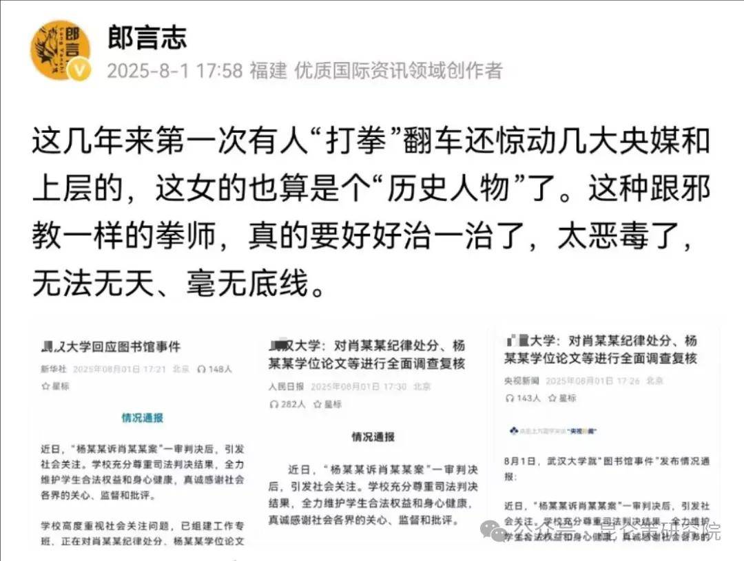 正如大家所见,某大学“图书馆事件”闹得沸沸扬扬,成为了现象级的舆情事件。杨某也成为了历史上第一个因为“打拳”翻车而惊动几大央媒的拳师,也算是个“历史人物”了。
