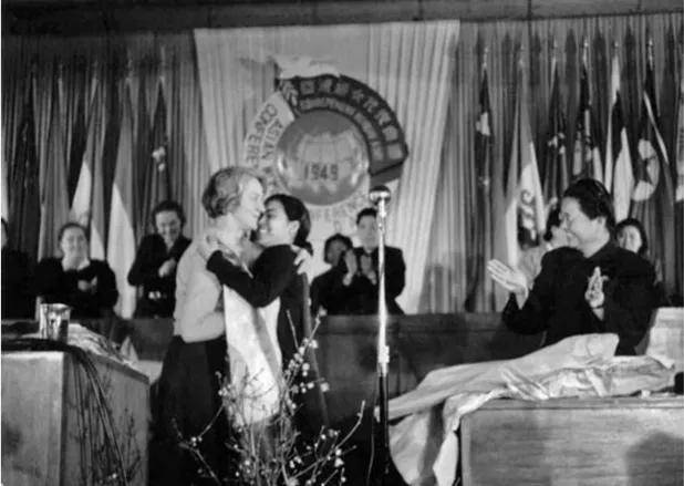 1949年12月,胡德明和金耐特·凡尔米什在北京举行的亚洲妇女代表会议上拥抱 | 图片来源:美国史密斯学院的索菲亚·史密斯档案馆