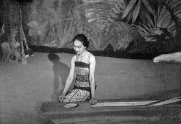 一张照片记录了她在《翻转的船》中的表演。她的身体被从侧面打来的光束照亮,在她背后投下阴影,裸露的肩膀显出些许脆弱。她若有所思低头凝视着倾覆的船体,背景是茂密的森林。这些文化表演也是政治性的,售票所得资金都资助了反法西斯抵抗运动。照片中,她平静、放松的姿势展示了她如何扮演命途多舛的公主达延扬·松比(Dayan Sumbi),但也展示了她如何塑造另一个角色——在法西斯军队占领的殖民地首都的文化大使。