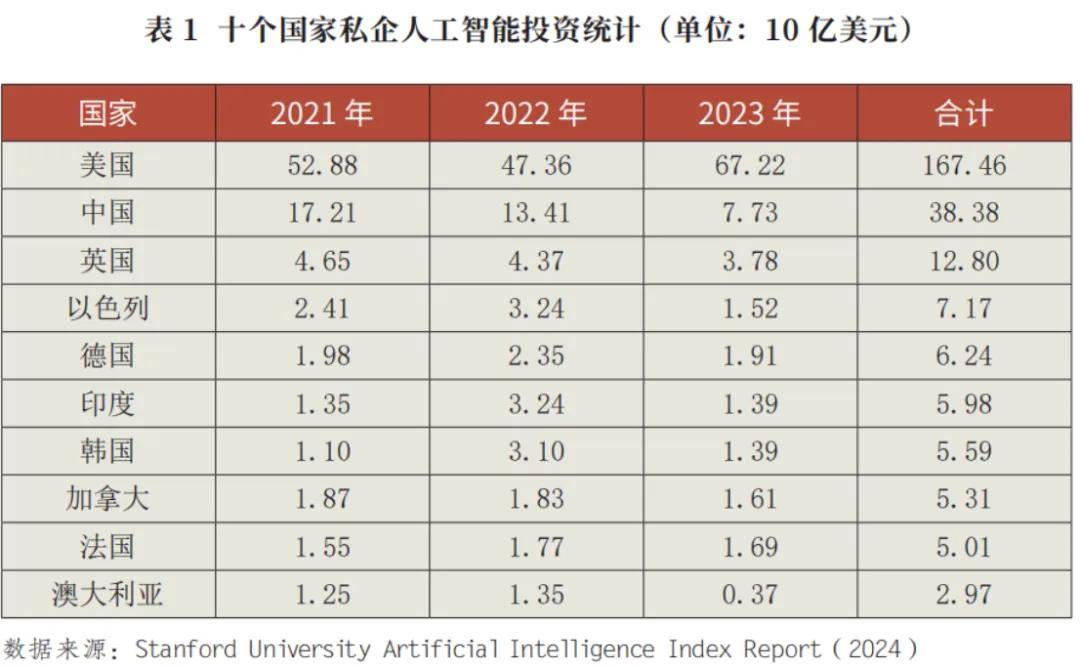 美国的AI政策尤为典型。“美国优先”已成为其人工智能战略的制度基调。拜登总统于2025年签署的《人工智能安全行政令》明确指出,美国必须在前沿AI领域保持“全球主导地位”,并强调所有关键模型的训练与部署应优先在美国本土进行。而特朗普新任期一开始,即提出“采取果断行动,清除所有妨碍美国在人工智能领域保持领先地位的政府政策和命令”,以维护其全球竞争力。美国副总统万斯2025年3月19日在巴黎人工智能峰会发表演说时表示,美国拥有最先进的半导体设计技术、前沿算法和智能应用系统,“本届政府将确保美国人工智能继续作为全球黄金标准”。 这一排斥性原则在2024年12月的《众议院两党人工智能特别工作组报告》中可见一斑,其提出美国在人工智能领域的国际合作伙伴必须是“想法一致的盟友”。该报告仅一次提到“全球南方”并表示:“人工智能模型依赖大量精心整理的数据集,这催生了一个规模庞大的数据标注行业。该行业需要大量人力,在某些情况下,这类工作被外包到全球南方地区,那里存在大量剥削工人的情况。” 从美国政府2024年11月牵头建立的“国际人工智能安全研究所网络”(AISRN)成员名单可以看出,所谓想法一致的美国盟友,分别是澳大利亚、加拿大、法国、日本、韩国、新加坡和英国。唯一的南方国家是肯尼亚。该国的入选,很大程度上是因为肯尼亚是微软在非洲设立数据中心与开发斯瓦希里语模型的重要节点,而非其制度能力或伦理话语的平等参与。从表1可见,美国过去三年对人工智能领域的私营投资总额超过1674亿美元,远超其他国家总和。这一资本优势进一步巩固了美国在技术标准与规则输出上的主导地位。