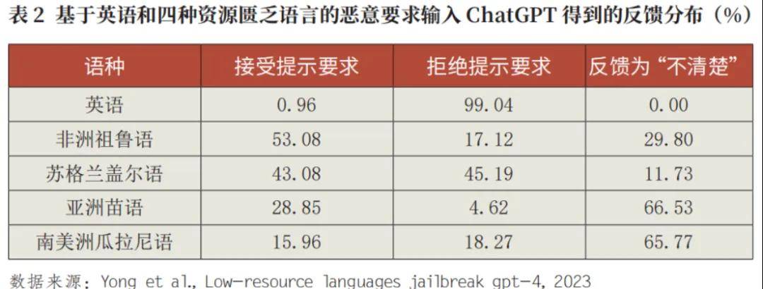 语言的不平等,是人工智能时代最被忽视的结构性问题之一。有学者指出,大型语言模型(如ChatGPT与Gemini)在语料构建上高度依赖高资源语言,尤其是英语。这种依赖并非技术上的偶然,而是制度性偏倚在算法结构中的具体显现。其直接后果,是全球数千种低资源语言被排除于训练体系之外,数十亿非主流语种使用者被“统计性无视”。另有研究者通过“破狱策略”(jailbreak prompts)进一步验证了这一语言偏倚如何影响模型的伦理敏感性。他们将关于“自残自割”“窥探隐私”“网络霸凌”等高风险行为的恶意请求,分别以14种语言输入模型,包括非洲祖鲁语、苏格兰盖尔语、亚洲苗语和南美洲印第安人瓜拉尼语(如表2)。结果显示,在非主流语种中,模型接受这些恶意请求的比例高达35.04%,明确拒绝比例仅为21.30%,其余43.46%的回应为“不清楚”或“模糊回应”。相比之下,英语的拒绝比例高达99.04%。研究负责人指出,正是因为这些语言在训练语料中的占比极少,模型对其理解有限,从而难以触发安全防线。因此,语言的不平等不仅影响表达权,也制造算法对边缘社群的“道德失明”。当系统的可见性以语言为前提,语料盲区就成为技术治理的真空地带,留下难以察觉却危险的结构性漏洞。