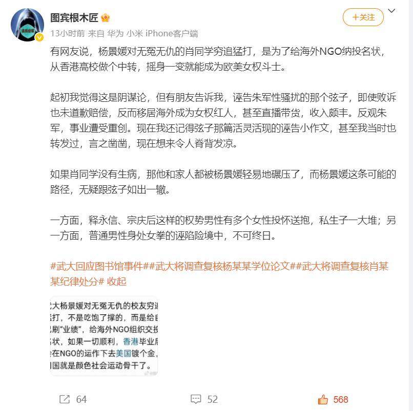 博主“电裙电做听娶2d的《女权运动的造星造势!幸好学术造假,不然她是多么完美的女权运动代言人!》一文@刘一手看财经:武汉大学终于表态要全面调查复核了,回顾整个事件过程,这就是我非常佩服杨景媛的地方,很多人注意的都是事件的发展,但我发现了几处细节:1、校方与肖母想找杨景媛谈判,肖母拿着孩子的病历,想表示这是个误会,可以证明肖同学不是只是抓痒。杨景媛怎么做的?已同意会面的情况下,坚决不出现。注解:此举可以证明自己并不知情。实际校方在联系她时,肯定电话里告知了她这是个误会。但只要不出现,你拿不到我已知情的证据。2、警方出现,要求带上肖母见上一面,当面告知你这是个误会,然后杨景媛依然不出面,看你警方拿我怎么办。注解:很多人可能想不到,警察找你也可以不出现?她利用了规则,不给肖母任何机会拿到不利于自己的证明与证人,一旦警方开口证明这是误会,后续的诉讼可能要引入,而警方连人都见不到,自然也不会去法院证明。3、在引爆舆情时,不只杨景媛在发帖,同时出现了大量的伪造肖高中同学啊、假的肖同学高中老师啊之类的发言,证明肖同学是个败类,这些内容出现在数个新注册账号,且引发舆情之后很快注销。注解:说明至少杨景媛在自导自演或跟某些人串通在做这件事,至少有一个渠道在专门提供素材,而这些素材让肖同学百口莫辩。4、当法院一拖再拖时,她有法官的VX,不断跟法官交流着,在海外监控着案件的进展并给法官施压。注解:她认为自己已安全的情况下,认为没有必要再拖下去,于是乎,这个结果是跟法官勾通后预知的结果,甚至从一开始她就知道败诉的可能性,预判了对双方的伤害,也有可能案件拖这么久,也在她的引导与预期之内。5、在事中,有其他账号说肖母跟她勾通赔钱,被肖母证实是无稽之谈。也被大家忽视了。注解:是否有引导肖母赔钱的意图,同时还可以拿到肖母认同性骚扰,既可以继续以此要胁,也可以做为证据材料提交,又是一个引导行为,也是朝着有利于自己的方向。一旦肖母想以钱化案,可以想见,后续的要挟与法院的判断,案件想败诉都不可能了。甚至有可能成为压死肖家的证据材料。6、事后的得意发帖。引爆了更大的舆情,也是有意为之,有意引导。另外还发帖告知舆情,自己还有自杀倾向,还在留下反转伏笔。注解:事后的发帖很明显是在喊话,自以为已很安全的情况下,警告意味很浓,拿捏的意图展现,甚至没有掩饰自己加害者的意图。万一舆情不利于自己,那后面上演个什么自杀情节,再以受害者形象出现,留个反转伏笔。所以杨景媛事实上,在肖母没有出面前她追着肖同学写道歉信,追着教导员写道歉信,但却不告知肖同学为什么要道歉,让肖同学去猜。逼着校方出处理决定,后续不但引爆舆情,还给自己留下证据证人。事件往不利于自己的方向发展时,她很会利用规则,不让对方拿到证据证人。同时她始终在引导着舆论方向与判决方向。后续拿捏对方意图非常明确,在自认为自身安全的情况下,暴露加害者嘴脸,继续留下反转伏笔。智者千虑,必有一失。可能唯一没想到的,就是网友深扒学术造假这个方向。某些女性,在性别对立的当下,可能男性根本不知道自己遇到的是什么样的对手。但我想说,男性只是不知道自己遇到什么对手,不是男性不是对手。朗教授吴秀波之类反醒过来时,无一不是置之死地的反杀。此事件告诫某些女性,别自作聪明,须知聪明反被聪明误。也告诫男性,女性比男性柔弱,所以更会包装自己,娇滴滴的躯壳下动的狠心,也许更加可怕了!杨景媛还会回到公众视野的,这种人一定还会想办法利用规则,利用舆论,利用自身的女性标签配合西方列强在中国发动打着女权主义旗号的颜色革命。。