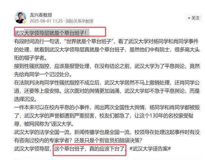 2025年8月1日四川外国语大学教授龙兴春直言:“武汉大学领导层就是个草台班子,真的早就该下台了。”武大的沉默激怒了很多人,其中包括著名校友、经济学家梅新育。这位毕业于武大世界经济系的博士公开喊话母校,要求“赶紧开除这种学生”,结果很快被发现微博被禁言,相关内容被删除。梅新育的遭遇并没有让批评声消失。复旦大学教授严锋直言:“公共空间,没有身体暴露,没有接触,没有偷拍,没有不端的证据,却不依不饶,毁人名誉乃至身心,这是越界了。”媒体人胡锡进也发声建议:“武大赶紧撤销对肖某的处分,该道歉的道歉,该调查的调查,别再寒了人心。”在这样的背景下,龙兴春教授的激烈批评显得顺理成章。这位北京外国语大学博士、曾在多所高校担任兼职教授的学者,显然无法容忍一所百年名校如此处理学生纠纷。值得注意的是,龙兴春的研究领域包括“国际传播与公共外交”,或许正因为如此,他更清楚武汉大学的处理方式对中国高校国际形象的损害。网友的愤怒不仅在于个案本身,更在于武大的处理方式可能产生的恶劣影响。有网友发现,那些扒杨景媛论文漏洞、质疑其学术不端的博主,账号要么被限流要么被删帖,甚至有人收到“侵权警告”。香港浸会大学的评论区更是被网友的举报信塞满,形成了奇特的跨校声援现象。武汉大学作为中国最顶尖的高校之一,其处理学生纠纷的方式有示范意义。一所大学可以为“舆情降温”而牺牲学生权益,司法判决已证明处分失当却仍不纠正,伤害的不仅是肖同学一家,更是公众对高等教育的信任。龙兴春教授那句“草台班子”的批评或许刺耳,在无数关注此事的网友看来却道出了症结所在,大学的管理层将“维稳”置于“公正”之上,行政技巧就会凌驾于教育理念之上。
