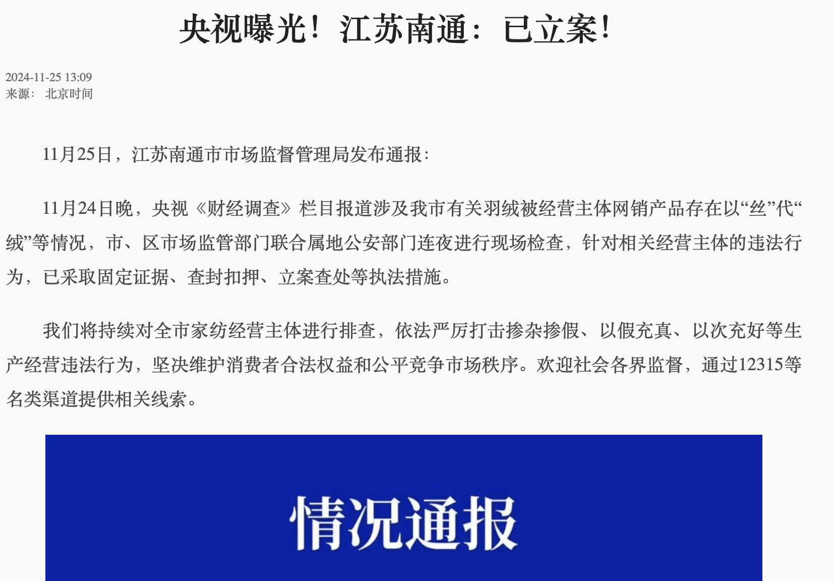 9月21日晚,央视财经频道《财经调查》栏目报道海宁市有关经营主体经销的床上用品“四件套”存在虚标支数的情况。海宁市市场监督管理局联合相关部门,连夜对涉事经营主体开展现场检查,针对涉嫌的违法行为开展立案调查。