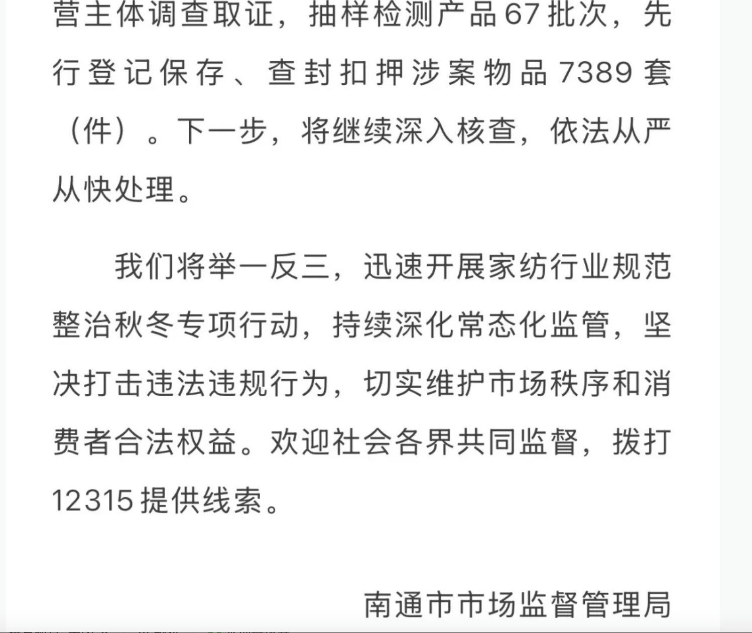 市场经济的健康运行,离不开公平、有序、安全的市场环境。而市场监督管理局作为维护这一环境的关键职能部门,平时工作在干嘛?怎么每次要等到媒体去曝光你们才闻讯而动?央视曝光的事不是存在一天两天,为什么一定要等到形成舆情的狂风巨浪才急急忙忙的救火?特别是南通在同样的事上,犯了两次错误,上一次也是家纺城部分产品质量问题被央视关注问候。当时好像有关部门的表态也是“举一反三”,这一年时间左右,南通家纺再遭央视曝光,这不仅仅是个别面料厂家的错,而是有关部门懒政的直接后果,好端端的市场被弄得乌烟瘴气,确实让人痛心疾首,维护好南通家纺业的品牌形象,要的是强化责任,做到事前防范。