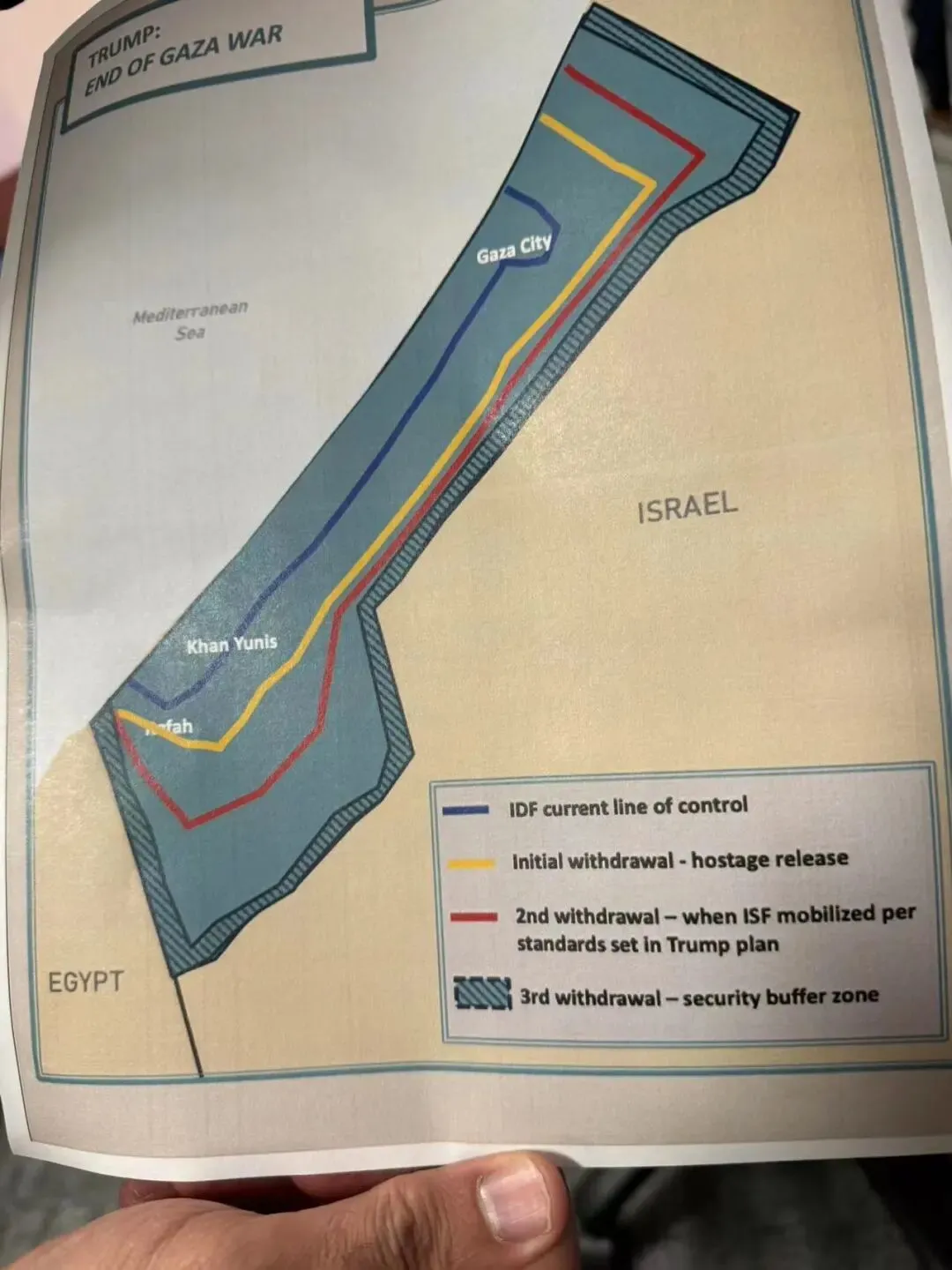 看披露出来的图片,以色列和内塔尼亚胡在交谈,特朗普手里拿的,就是以色列分阶段撤离加沙态势图,内塔尼亚胡则在指指点点。