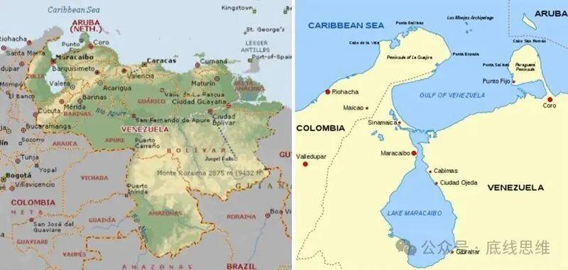 委内瑞拉版图,注意其左上角泪滴状的大湖(右下)、近于长方形的喇叭口海湾(右上)