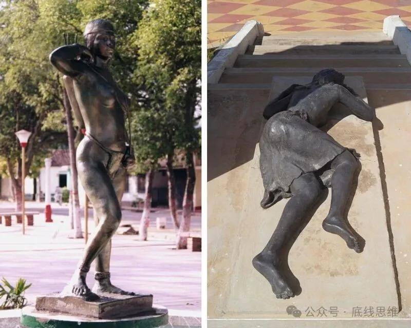舒丽雅(左)和薄蕾拉(右)都在今天的委内瑞拉有雕像。不过一个是背着毒箭袋、拿着弓挺然屹立的,另一个是趴伏在殖民者丈夫奥赫达坟上的(传说中她殉情而死的场景)。
