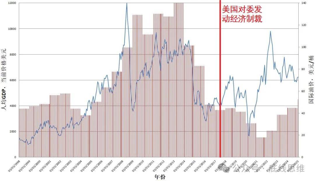 1998年至2024年委内瑞拉人均GDP(红色柱图)和国际油价(蓝色折线)