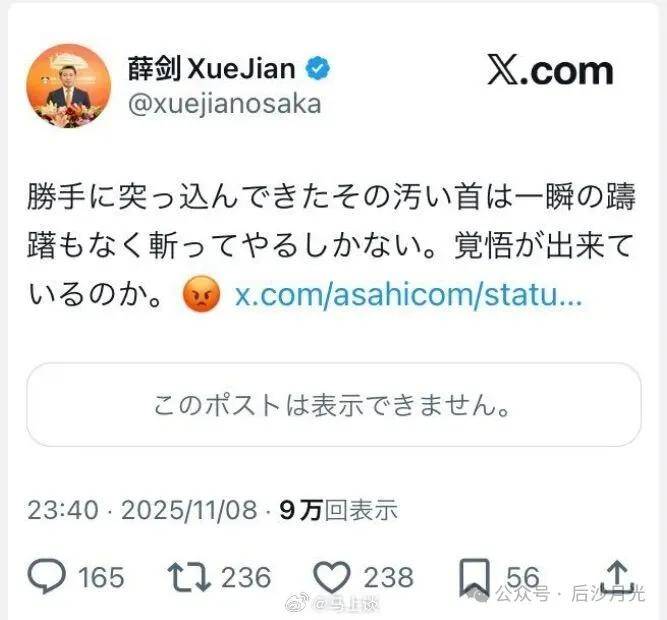 11月8日深夜,中国驻大阪总领事薛剑在X上发文警告:“对于擅自闯入的肮脏的脑袋,我们别无选择,只能毫不犹豫地将其斩落。你做好心理准备了吗?”(他发的是日文,翻译成汉语读起来有点别扭)