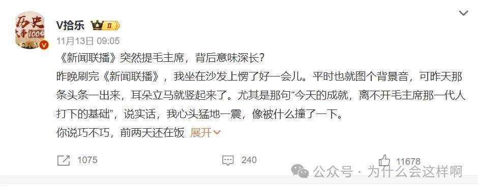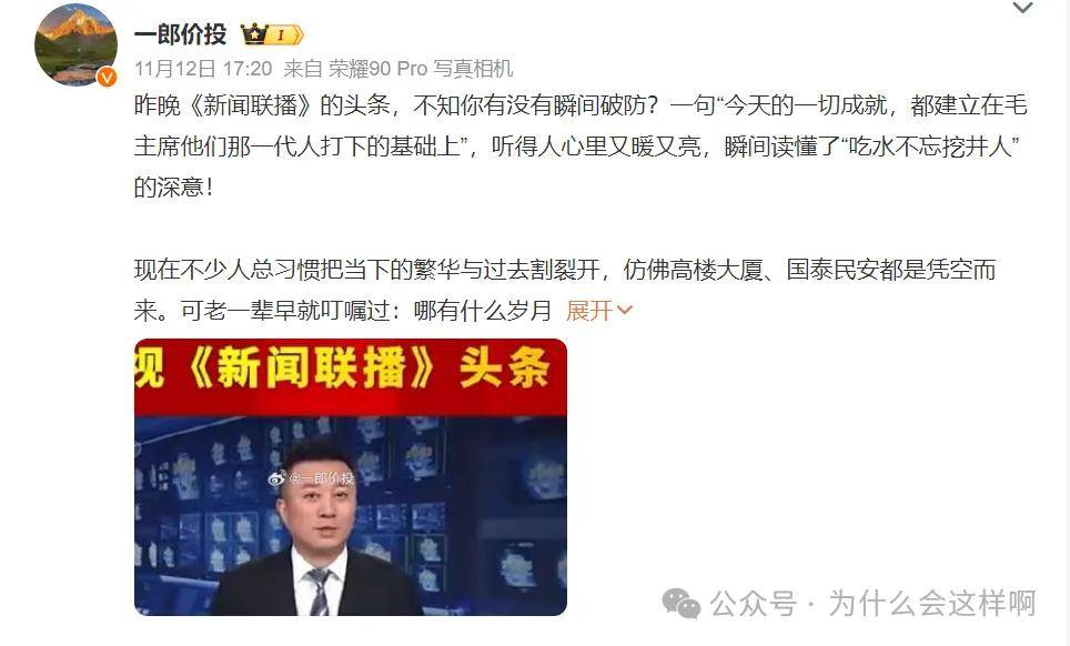 这几天,接连看到一些微博还有文章提到了近日央视的《新闻联播》中专门提到中国今天的一切成就,都是建立在毛主席等老一辈革命家打下的江山,攒下的家底之上......许多听到新闻联播这段话的群众,都忍不住心情激动,高兴万分,在高兴之余,纷纷以自己的方式奔走相告,或者写文章,或者发微博,纪念这难得一见的事情。