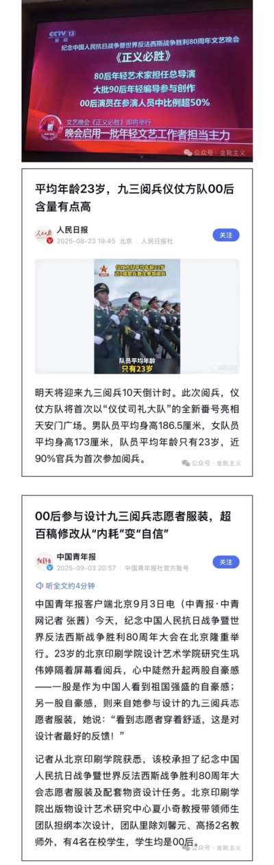 今年的九三阅兵相关活动、尤其是文艺晚会已经毫无保留的揭示了一个道理:一旦放弃那帮「封建殖登」、将制作公共文艺作品的权力从这帮人的手里拿掉转而交给新青年,我们会发现,真是肉眼可见的海阔天空。
