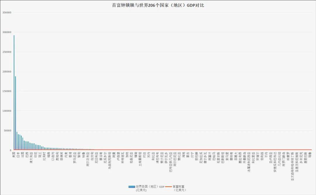 排名第168-206名的39个国家GDP的总和为721.84亿元。也就是说中国首富钟睒睒744.08亿美元的财富超过了这39个国家GDP的总和。