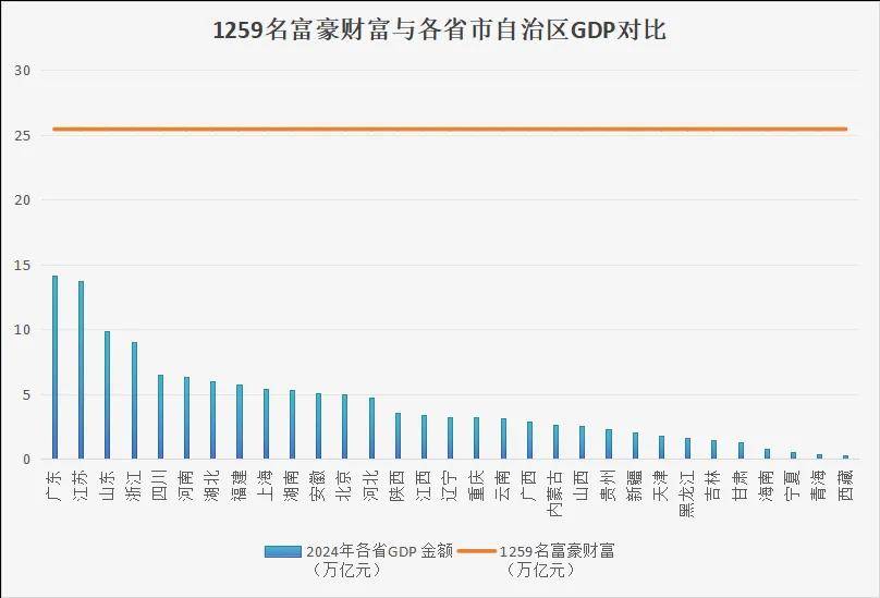 中国2024年GDP为134.9084万亿元。就是说,这1259名富豪的财富25.4461万亿元人民币是中国GDP的18.86%。