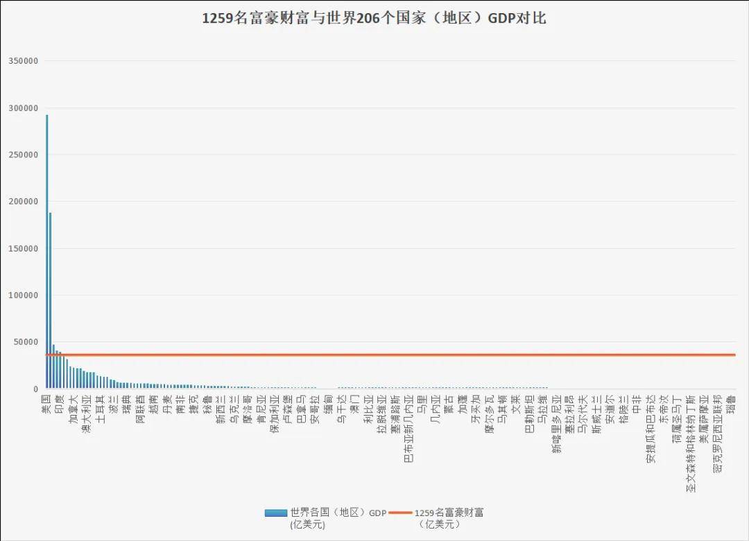 1、可以看到,这1259名富豪3.5724万亿美元的财富(下图橙色直线)在全世界GDP排名中,排在美国、中国、德国、日本、印度、英国GDP之后,可以排名第七位,超过了法国、意大利、加拿大、巴西等199个国家(地区)的GDP。