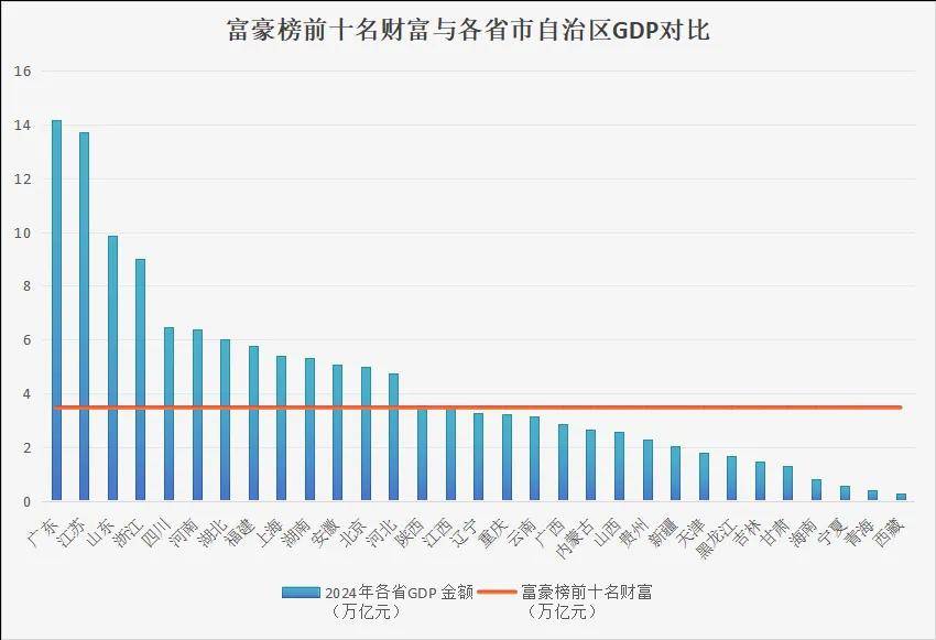 2、富豪榜前十名(钟睒睒、张一鸣、马化腾、曾毓群、雷军、张磊、黄峥、何享健、李书福家族、马云家族)的财富总和为3.468万亿元人民币,在各省市自治区的GDP总排名为第15名。超过甘肃、海南、宁夏、青海、西藏五省区GDP之和(3.32万亿人民币)。