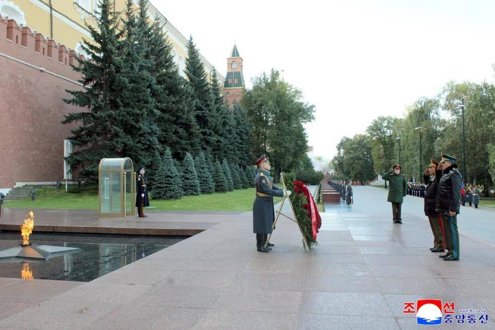雕像揭幕仪式前,努光铁率朝鲜军事代表团前往克里姆林宫墙外无名烈士墓敬献花圈