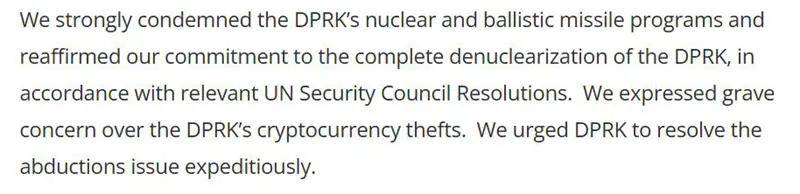 对朝鲜盗窃加密货币表示严重关切。