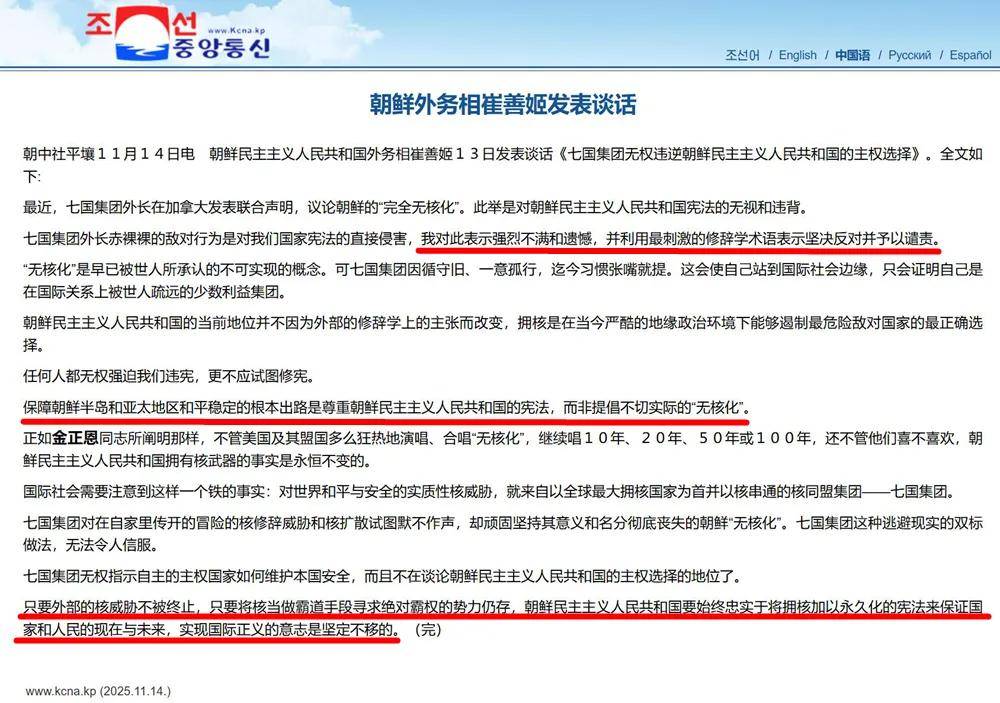 G7外长的上述表态没有超纲,算是老生常谈,但惹得朝鲜十分不高兴。朝鲜外务相崔善姬亲自出马,于11月13日晚发表谈话,题为《七国集团无权违逆朝鲜民主主义人民共和国的主权选择》;14日一早,不仅朝中社对外发布消息,《劳动新闻》也在第三版头条对内发布了这则谈话。