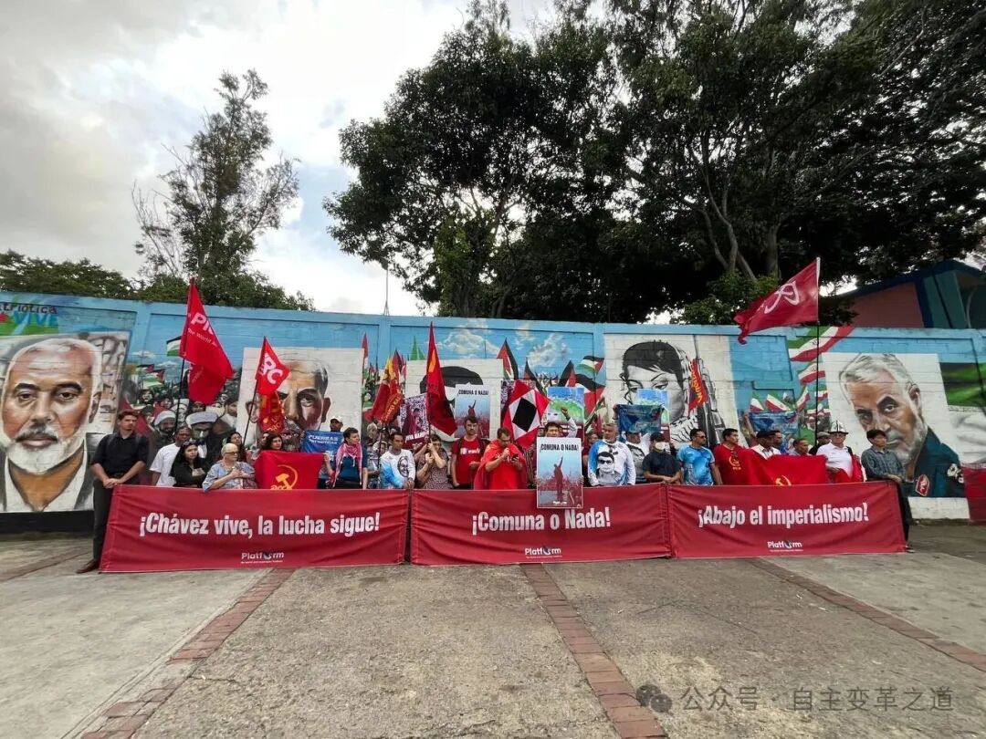 参与者们高举写有“¡Chávez vive, la luncha sigue!(查韦斯永垂不朽!斗争仍在继续!)”“¡Communa o Nada!(公社万岁!)”“¡Abajo el imperialismo!(打倒帝国主义!)”的横幅,有力地呼喊着口号。