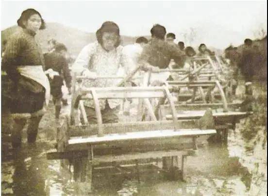上世纪50年代中期,浙江建德县千鹤村妇女下田从事农业生产劳动场景。当时,全国农村正进入农业合作化高潮,为缓解劳动力不足问题,建德千鹤村妇女打破旧俗,走出家门参加劳动,投身农业生产,喊出了“劈山拦河溪改田”的口号,形成了“不等不靠、敢想敢干、团结协作、艰苦创业”的千鹤妇女精神 | 图片来源:网络